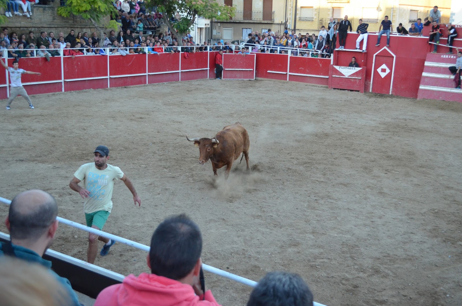 Santacara 18 de Septiembre de 2016 - Vacas en la Plaza de Hermanos Arriazu - Secuencia cuando la vaca sube a las gradas - Jonatan Corredera, no se lo que le habías hecho a esta vaca, pero estaba claro que iba a por ti.